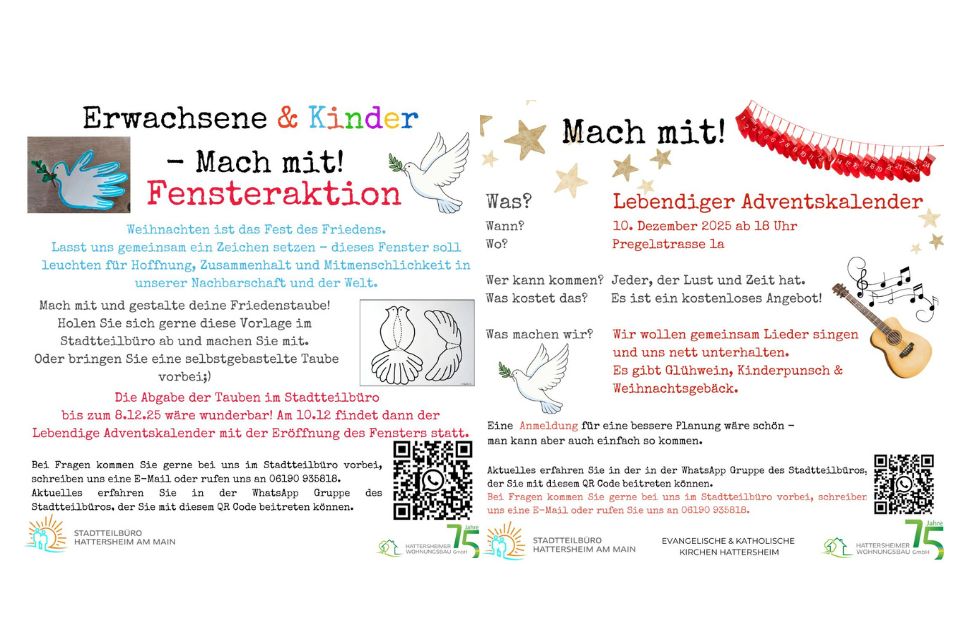 "Mach mit!" Fensteraktion und Lebendiger Adventskalendar Mach mit – Für Frieden, Gemeinschaft & Adventsfreude! In diesem Jahr setzen wir gemeinsam ein Zeichen der Hoffnung. E[...]>