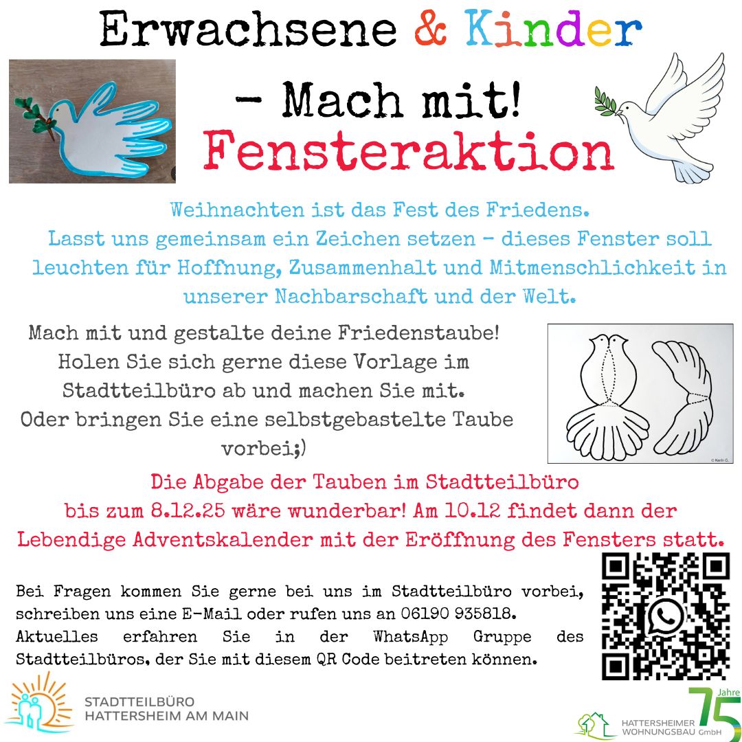 Bringt eure Tauben bis zum 8. Dezember 2025 ins Stadtteilbüro und lasst unser Adventsfenster leuchten!