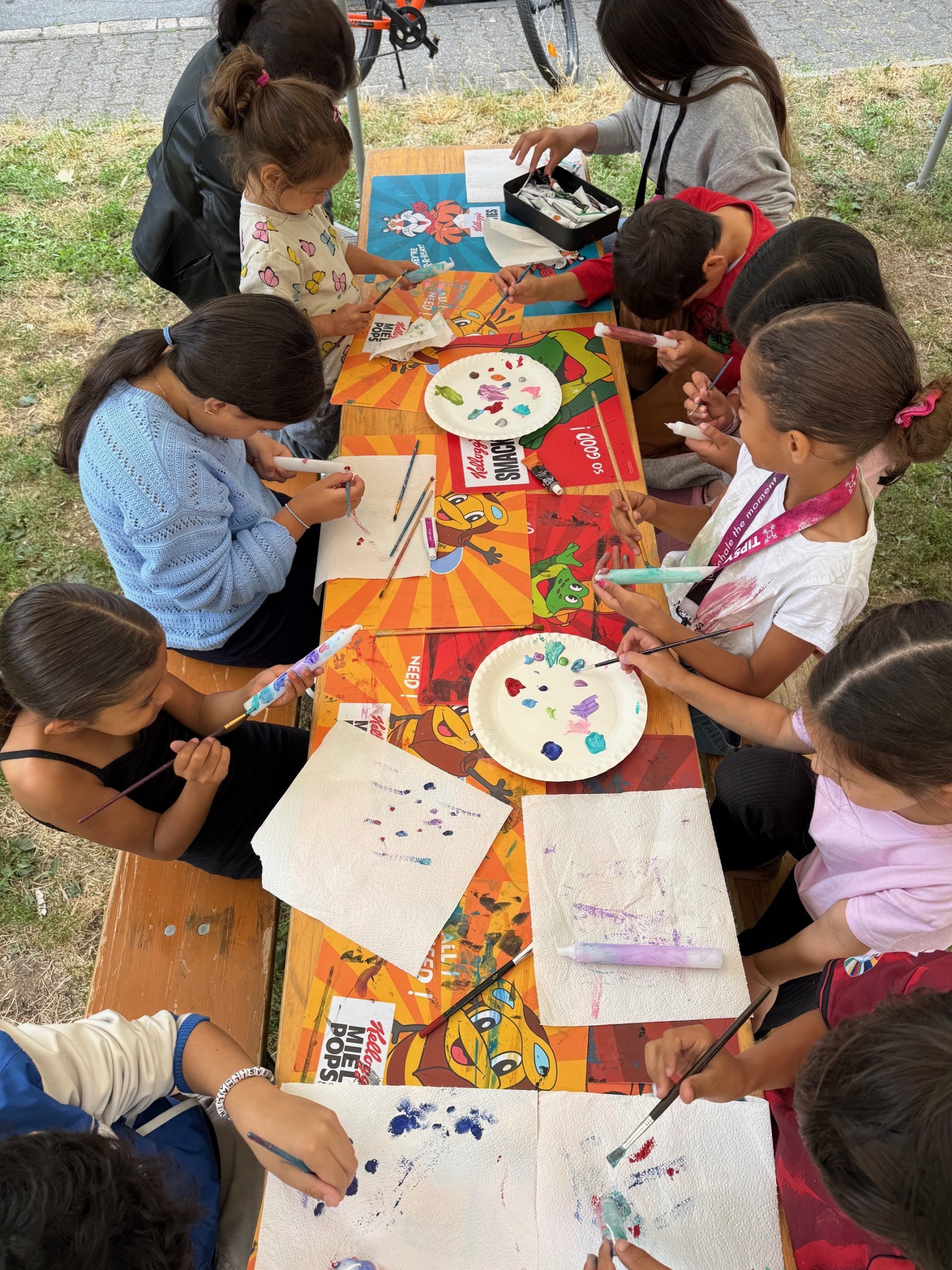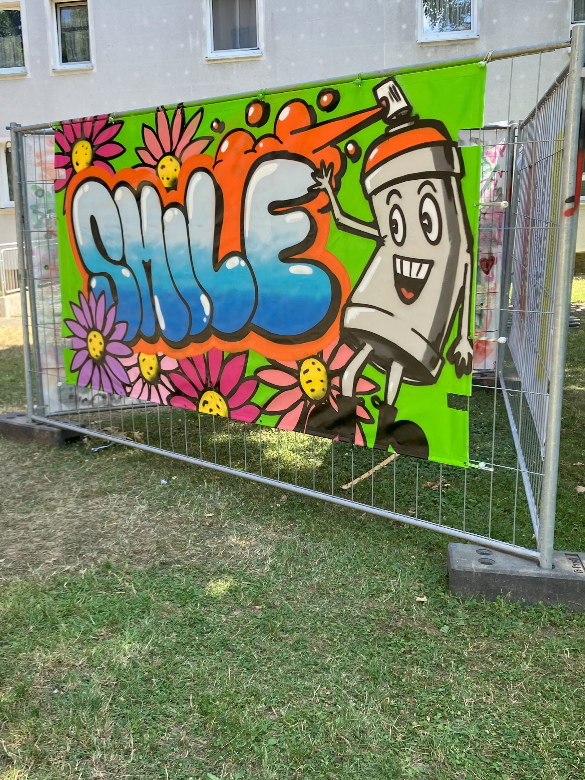 In der ersten Woche gab es an 4 Tagen Graffiti-Workshops die in Kooperation mit dem Kulturforum im Rahmen der Jugend-Kultur-Tage durchgeführt wurden. Unter Anleitung von Mathias Weinfurter fanden spannende Gruppenprozesse statt und wurden großartige Graffitis auf mobile Banner gesprayt. Ergänzt wurde dieses Angebot von offenen Spielmöglichkeiten für alle Kinder, ein tägliches Mittagessen für alle und am Freitag einen Ausflug in Stadion-Schwimmbad in Frankfurt.
