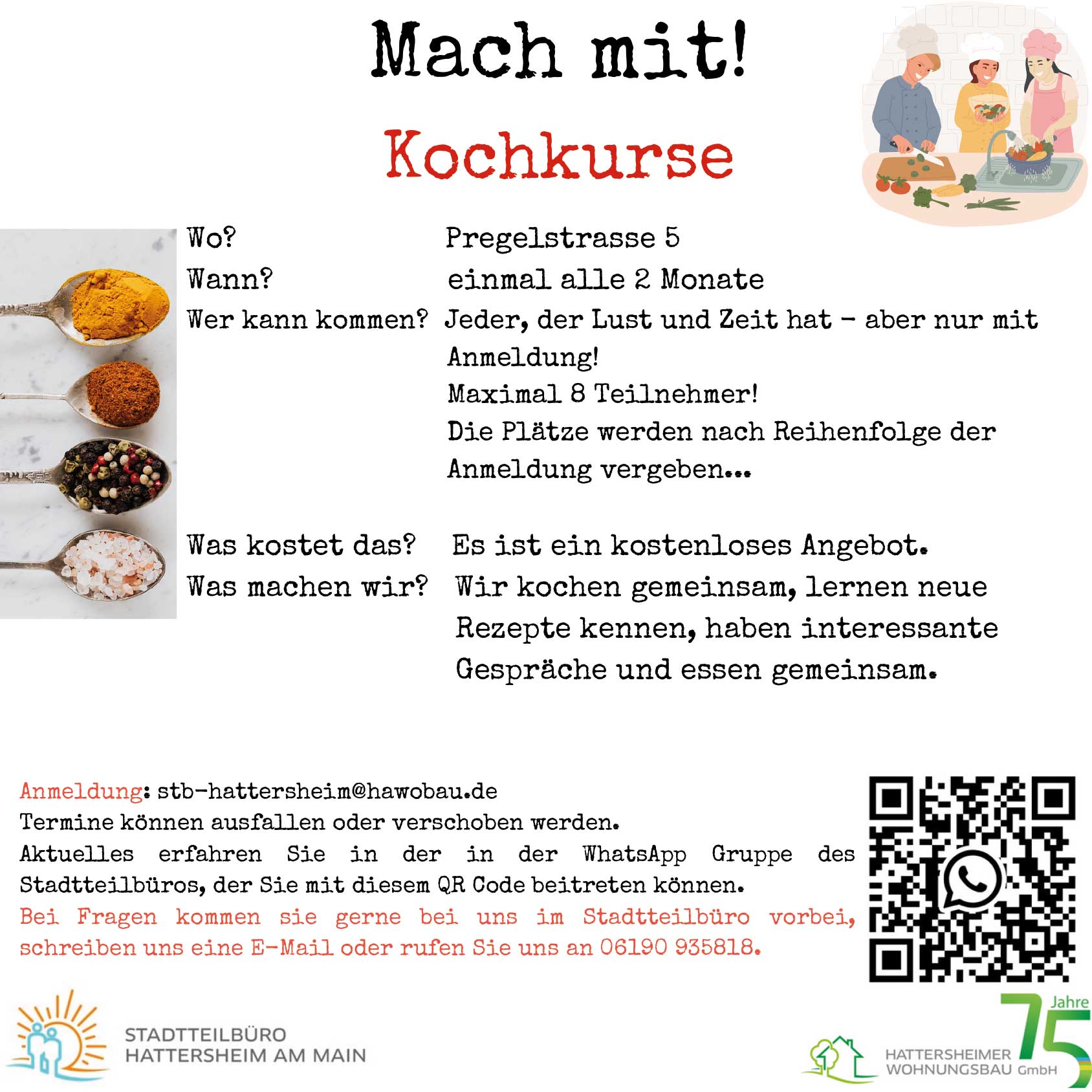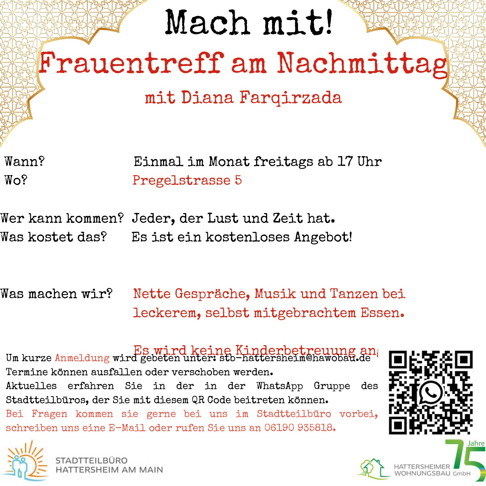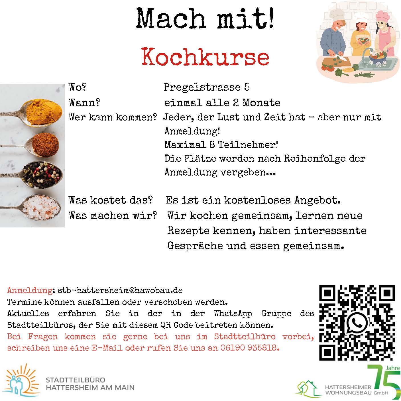 Anmeldung und Informationen direkt im Stadtteilbüro, per E-Mail an stb-hattersheim@hawobau.de oder rufen Sie uns an unter der 06190 935818.