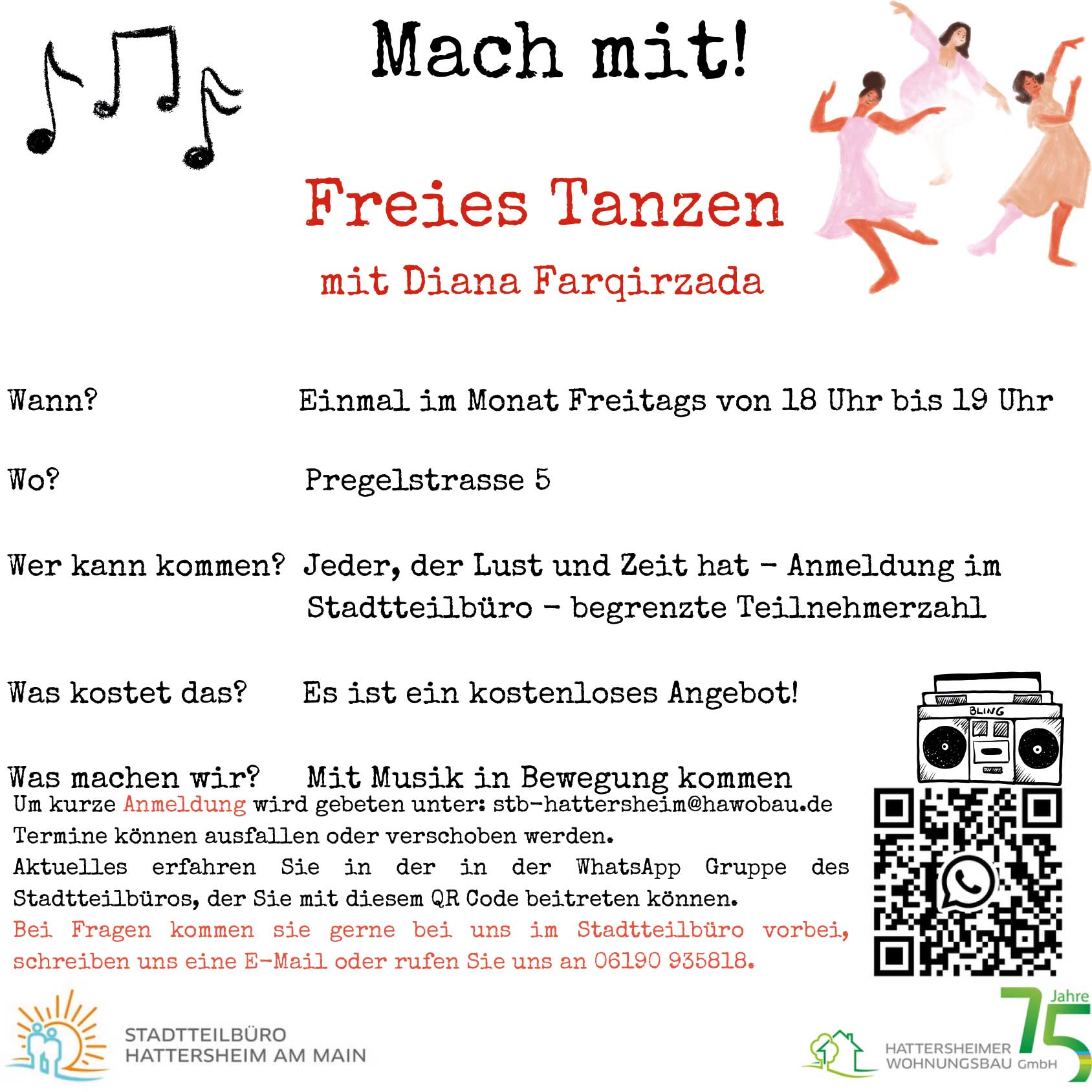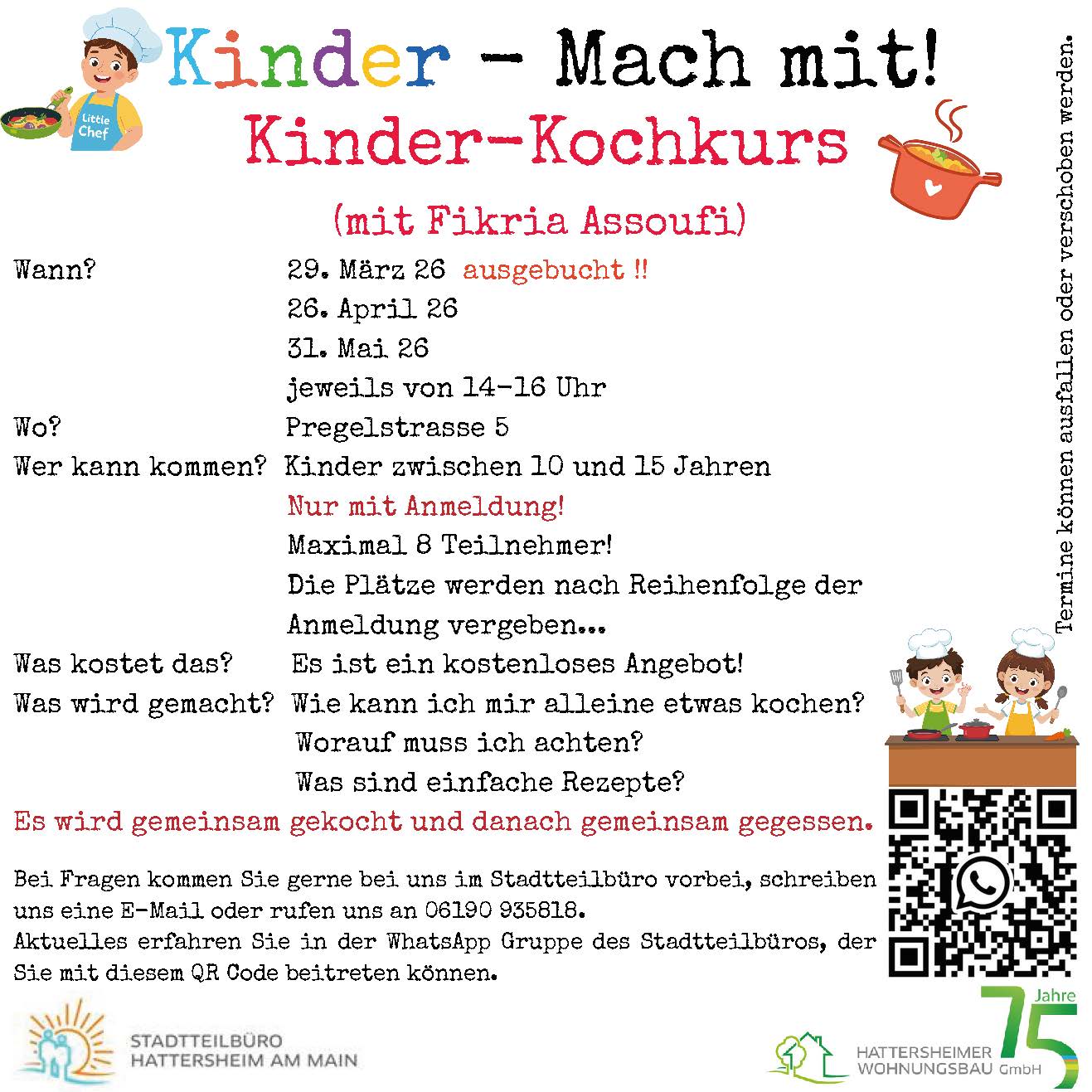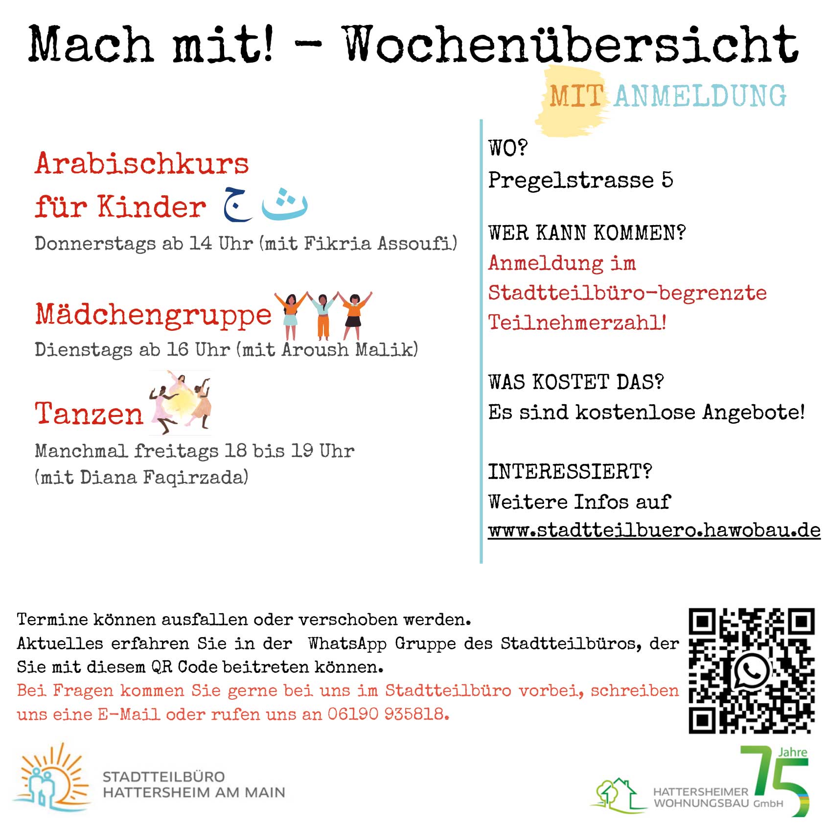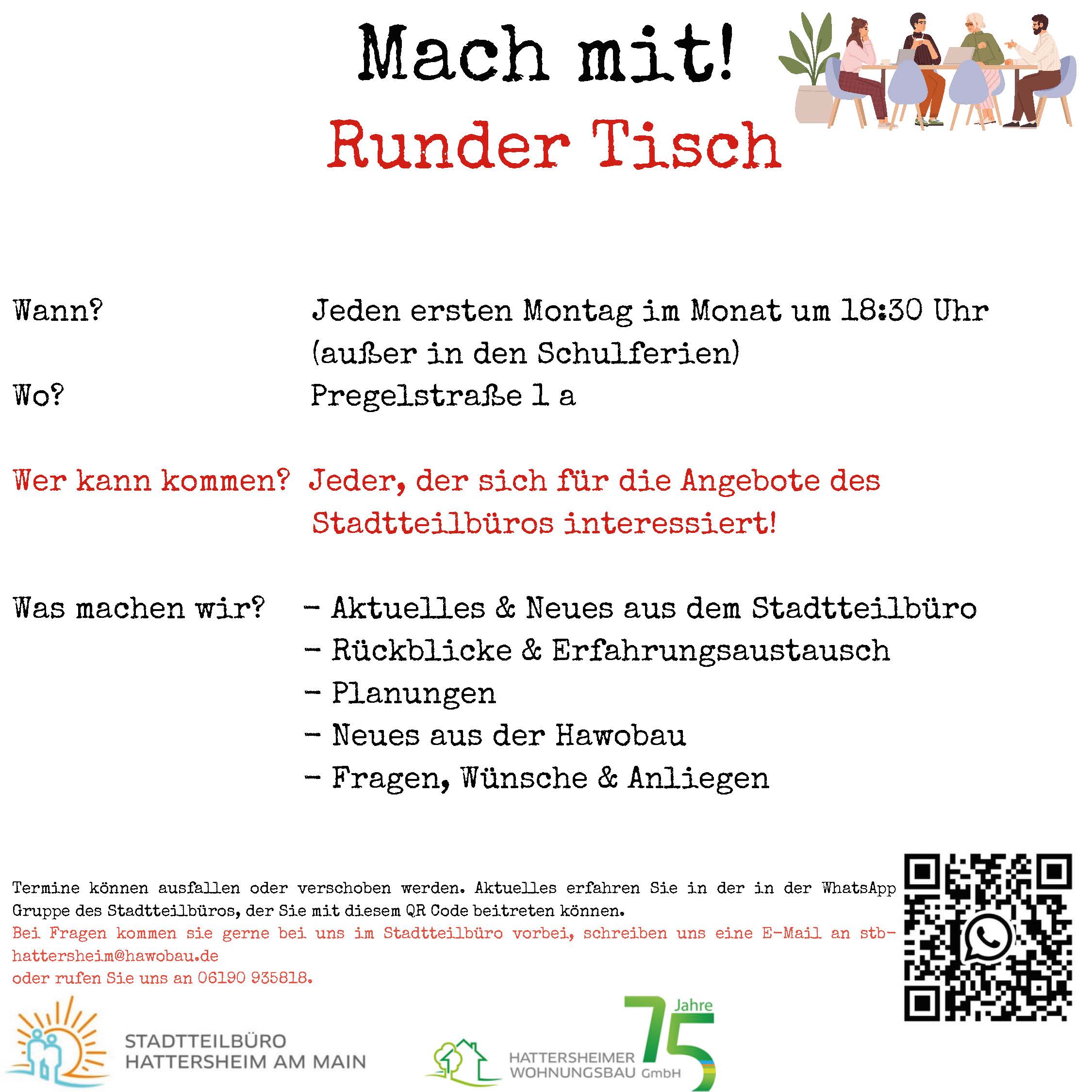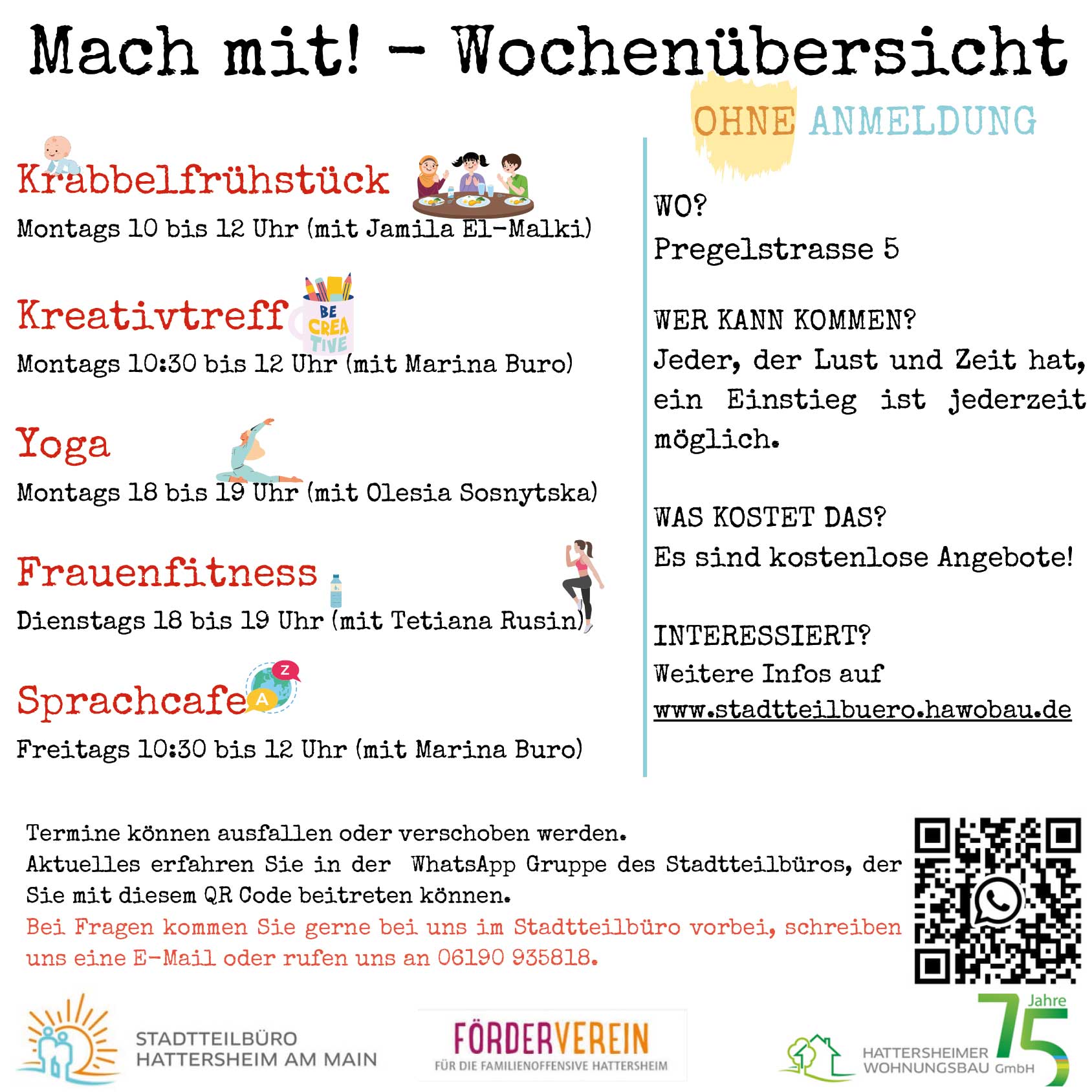 Aktuelle Informationen sowie Hinweise zu möglichen Terminänderungen oder -ausfällen erhalten Sie über die WhatsApp-Gruppe des Stadtteilbüros, der Sie über den QR-Code beitreten können.