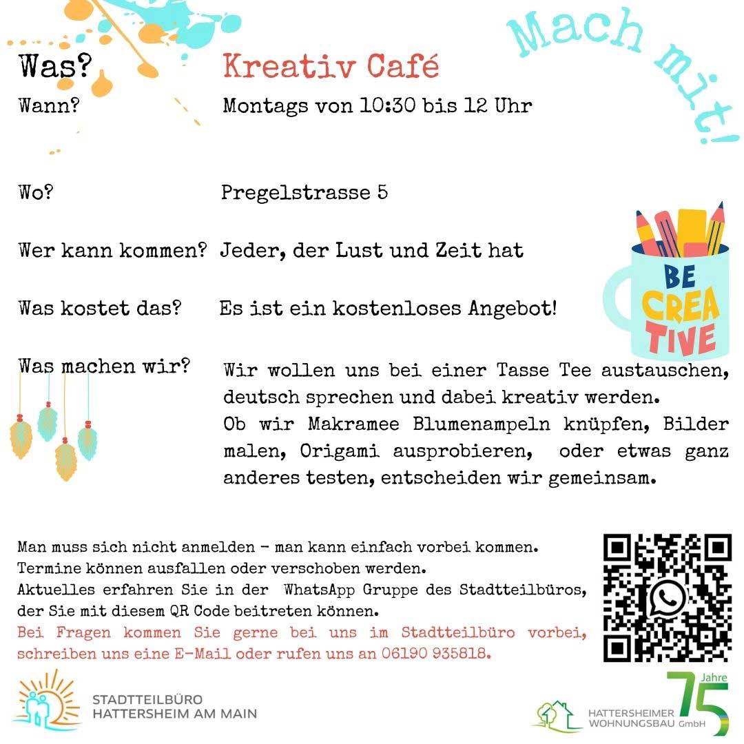 Montags von 10.30 bis 12 Uhr findet in der Pregelstrasse 5 das Kreativtreff statt. Wir wollen gemeinsam Kaffee trinken, uns austauschen und dabei kreativ werden. Ob wir Makramee Blumenampeln knüpfen, Origami ausprobieren, Karten gestalten, oder etwas ganz anderes testen, werden wir gemeinsam entscheiden. Das Angebot ist kostenlos und ein Einstieg ist jederzeit möglich. Um besser planen zu können, wie viel Material wir benötigen, wäre eine Anmeldung unter : stb-hattersheim@hawobau.de wunderbar.
