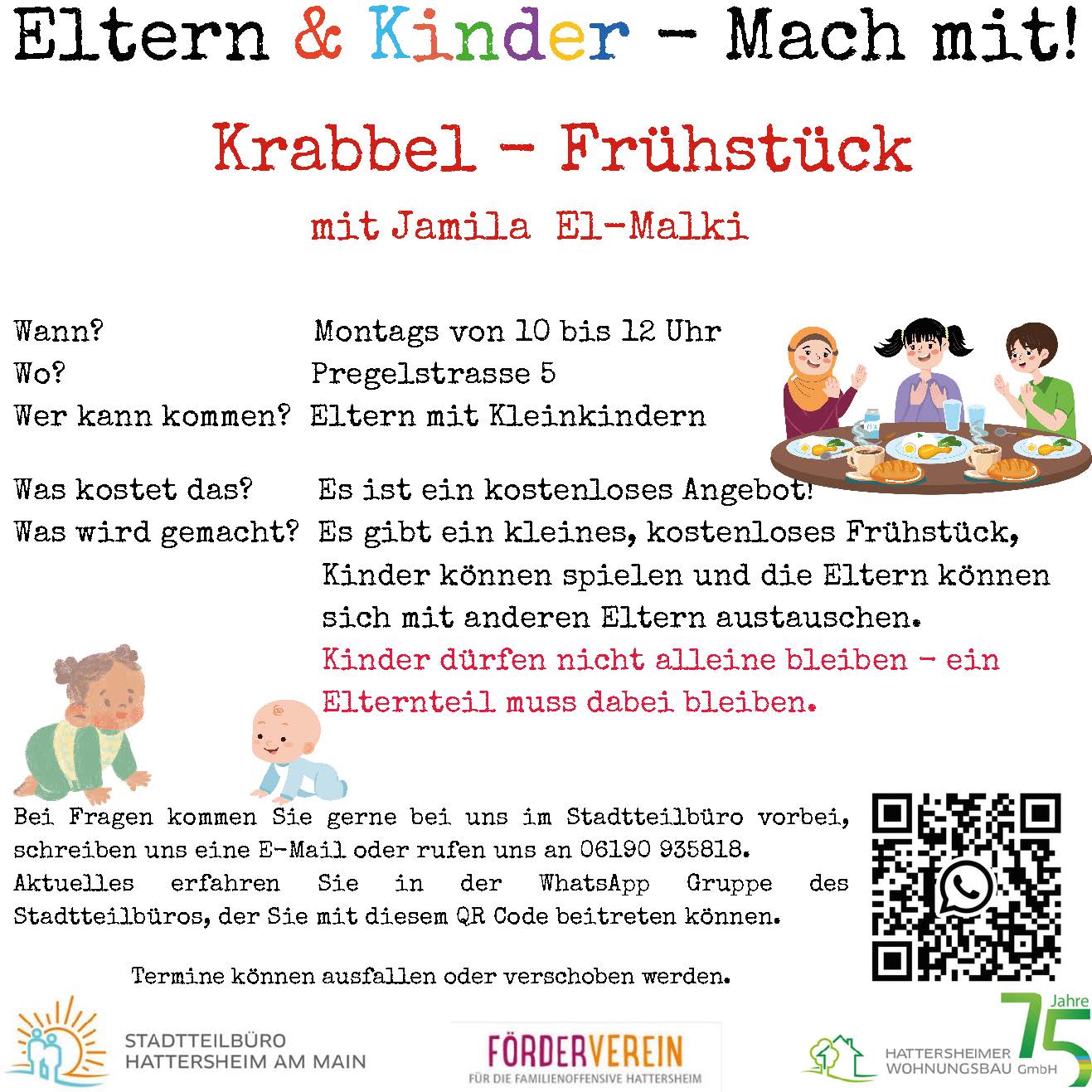 Das Krabbel-Frühstück ist ein offenes und kostenloses Angebot für Eltern mit Kleinkindern und findet seit Dezember montags von 10:00 bis 12:00 Uhr in der Pregelstraße 5 statt. In Kooperation mit dem Förderverein der Familienoffensive gibt es dieses wunderbare Angebot, das von Jamila El-Malki initiiert wurde. Frau El-Malki arbeitet an anderen Tagen in der Kinderbetreuung und ist eine engagierte Bewohnerin des Stadtteils, die das Krabbel-Frühstück ehrenamtlich organisiert. An dieser Stelle ein herzliches Dankeschön für ihr großes Engagement.
