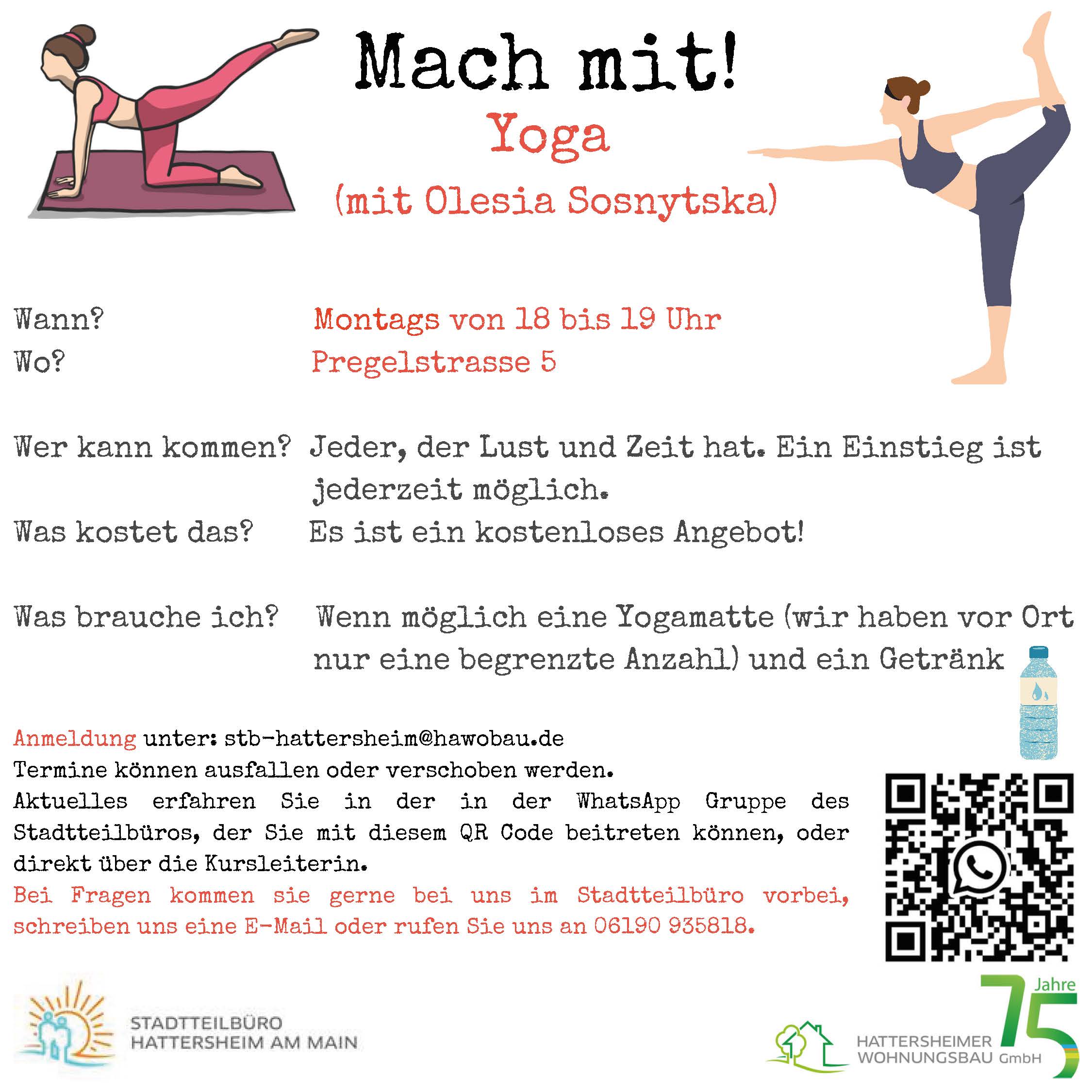 Die Kurse sind kostenlos und ein Einstieg ist jederzeit möglich. Es wäre gut, wenn Sie eine Yogamatte und Wasser mitbringen könnten – sollten Sie keine Matte besitzen, haben wir auch einige vor Ort, die wir verleihen können.